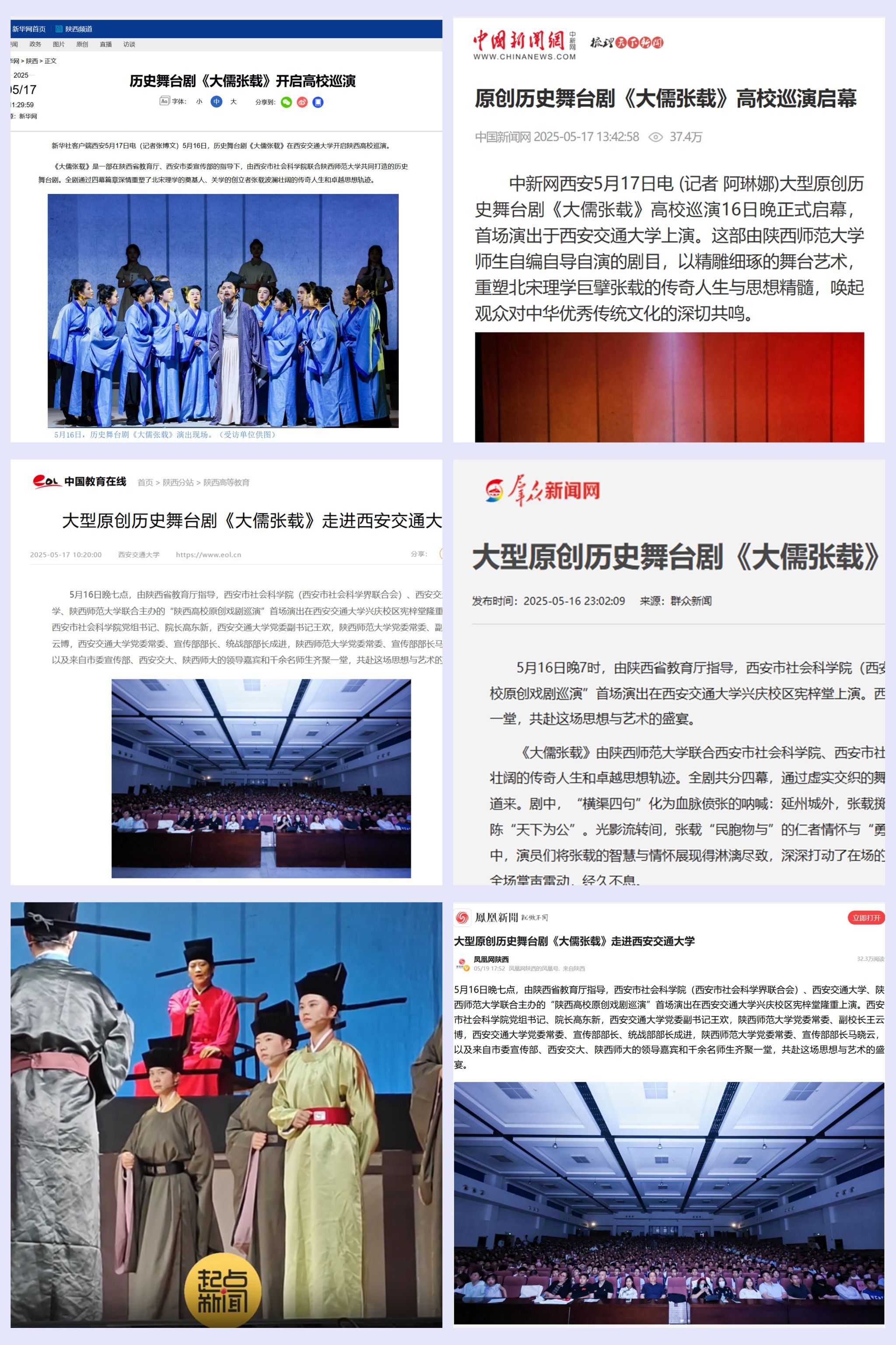 师大新闻网讯 5月16日至24日,在陕西省委教育工委、省教育厅的指导下,西安市委宣传部的支持下,由新莆京官网联合西安市社会科学院联合出品的历史舞台剧《大儒张载》参加“陕西高校原创戏剧巡演”活动,先后在西安交通大学等4所高校巡演。陕西省委教育工委、省教育厅、西安市委、西安社科院及各高校领导嘉宾以及4000余名师生到场观演。新华网、中新网、中国教育在线、群众新闻网等20余家主流媒体对活动进行报道。